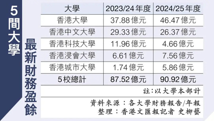 另外,港大2024-2025年度财务报告显示:学校年度综合盈余46.47亿港元,远超其他港校,资产总值586.36亿港元、负债总额179.6亿港元。虽然财务数据比较漂亮,但资金大多已指定用途。