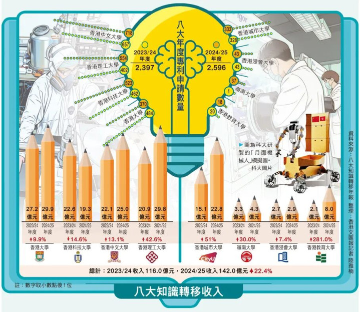 而港八大的2024/25年度知识转移年报中,港大以29.9亿元收入蝉联榜首,按年增长9.9%。